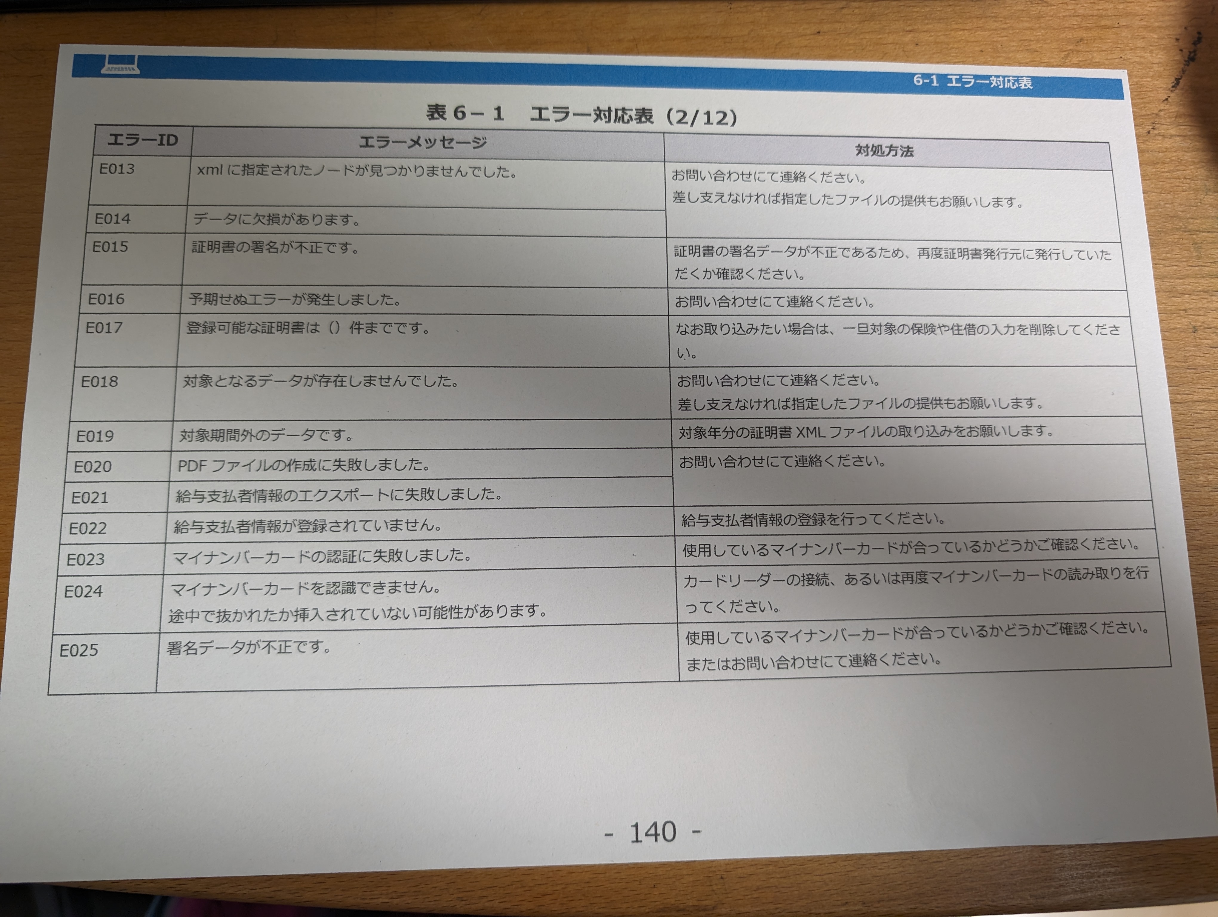 年調ソフト操作マニュアルのp. 140のエラー対応表のページを、スマートフォンを用いて撮影した画像を読み込ませ、表形式を保ったまま文章を紙面通りに読み取ることができるかどうか