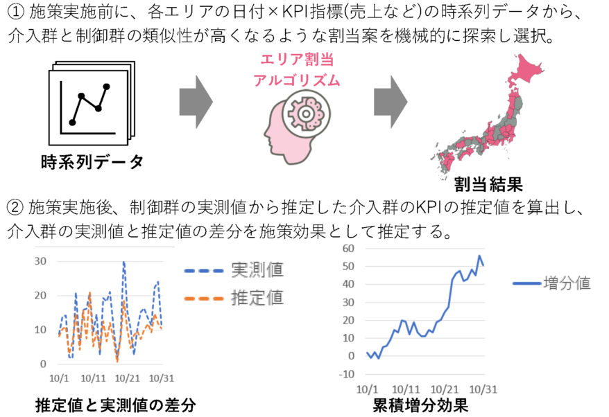 ①施策実施前に、各エリアの日付×KPI指標(売上など)の時系列データから、介入群と制御群の類似性が高くなるような割当案を機械的に探索し選択。