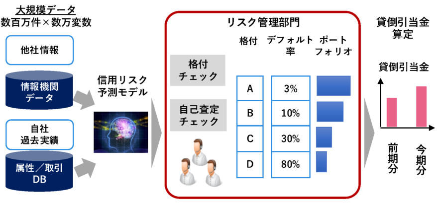 - 現状、属性マトリックスで信用リスクの格付を付与しているが、データに基づく客観的な格付を付与したい。また、大規模データの活用した格付や、格付の算出も実現したい。
