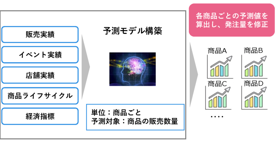 精緻な商品需要予測を実現するために、売上実績だけでなく、マーケティングデータを活用し、最新の機械学習予測モデルを利用した。