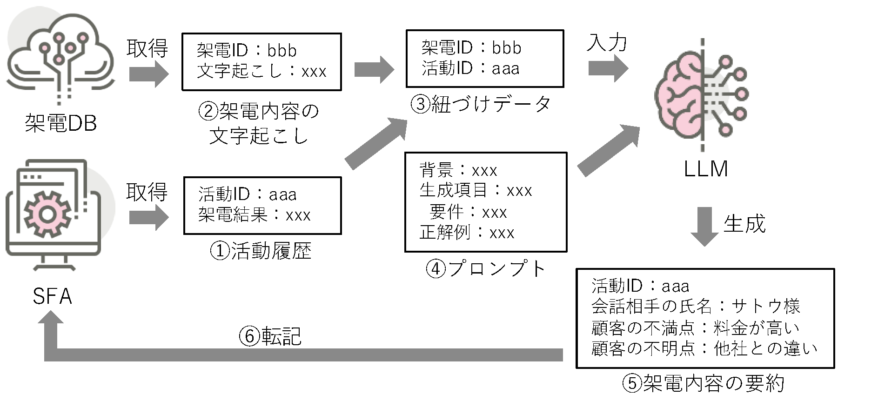 - セールスが架電毎にSFAに引継事項を入力しているが業務負荷が大きい状況。LLMを活用して架電内容の要約を生成し、引継事項としてSFAに転記させることで業務効率化を行いたい。