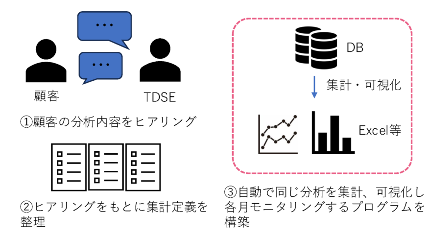 顧客の実施した分析内容をヒアリングし、集計定義を整理した。 さらに、同じ分析をモニタリングできるよう、Python、SQLを用いてExcel形式のアウトプットを各月で出力する自動更新プログラムを構築した。