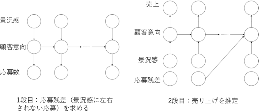 - 2段階状態空間モデルを構築することで、売り上げへの景況感の作用を推定することができた。また、それによる交絡を除いた応募→売上の効果を定量的に測定できた。