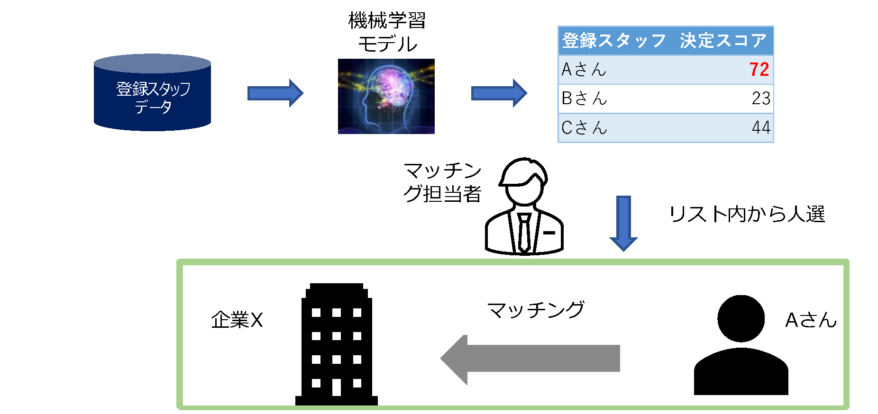 - 企業と派遣登録スタッフのマッチングを行う担当者によって、知識量やスキルに差があり、マッチング成功率に差ができている。その中でも登録スタッフの情報精査・選定に時間を要しており、短時間で誰でも適切な人選ができるようにしたい。