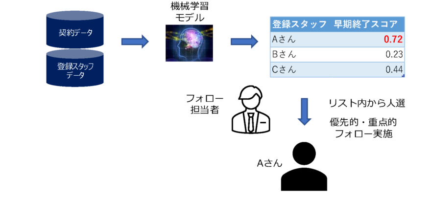 - スコアリングとリスト化によるフォロー漏れ防止と重点フォローにより、早期終了率2%の改善を目論んでいる(テスト運用中)