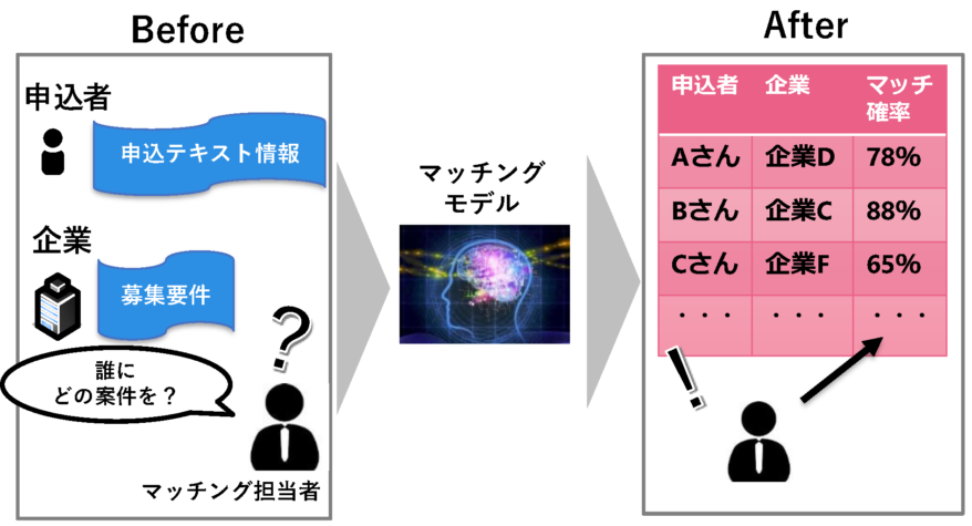 - 企業の募集要件のテキスト情報、申込者の申込テキスト情報から人手でのマッチングを図っていたが、AIを活用してもっともよい企業と申込者の組み合わせを知りたい。