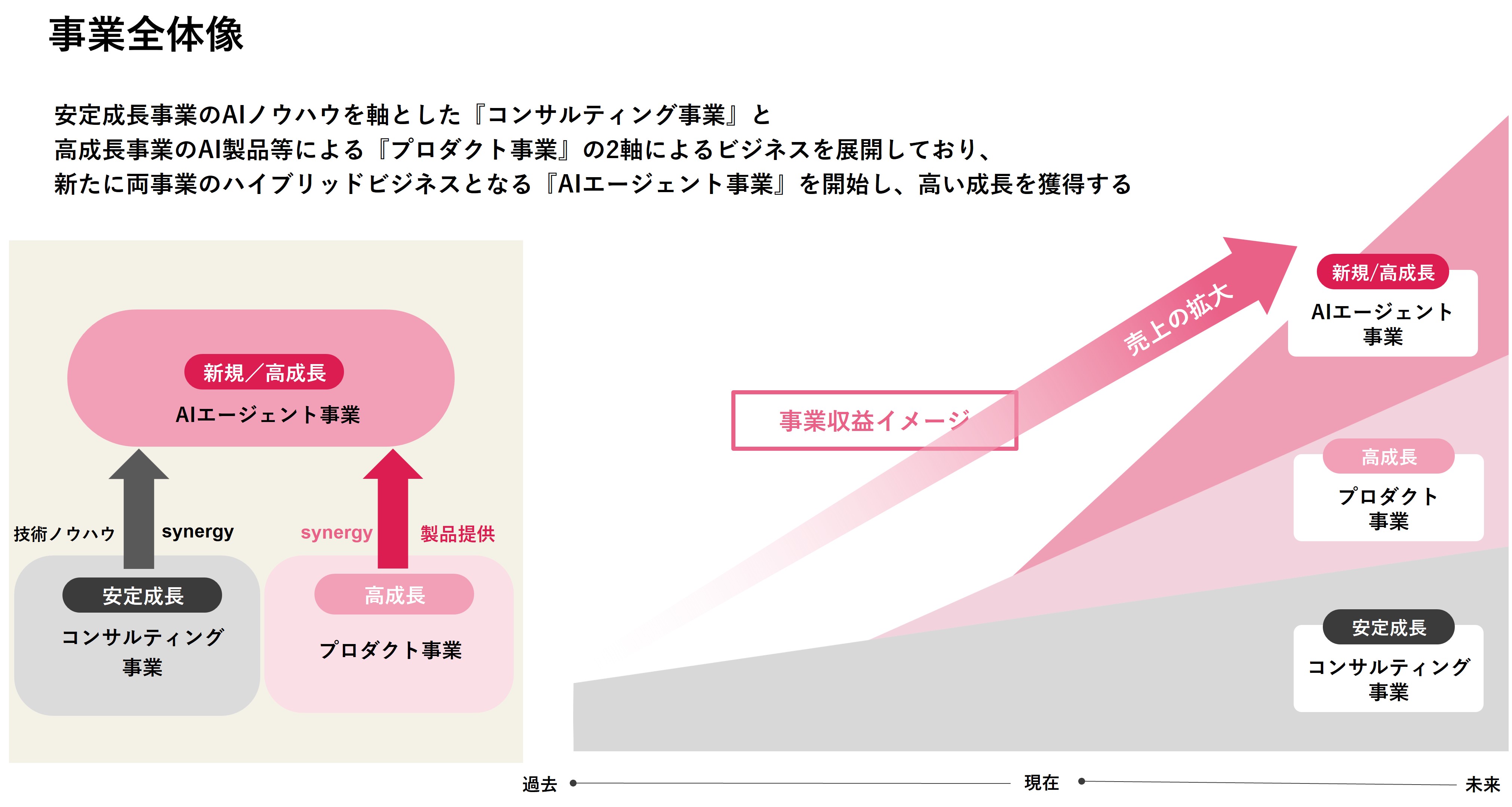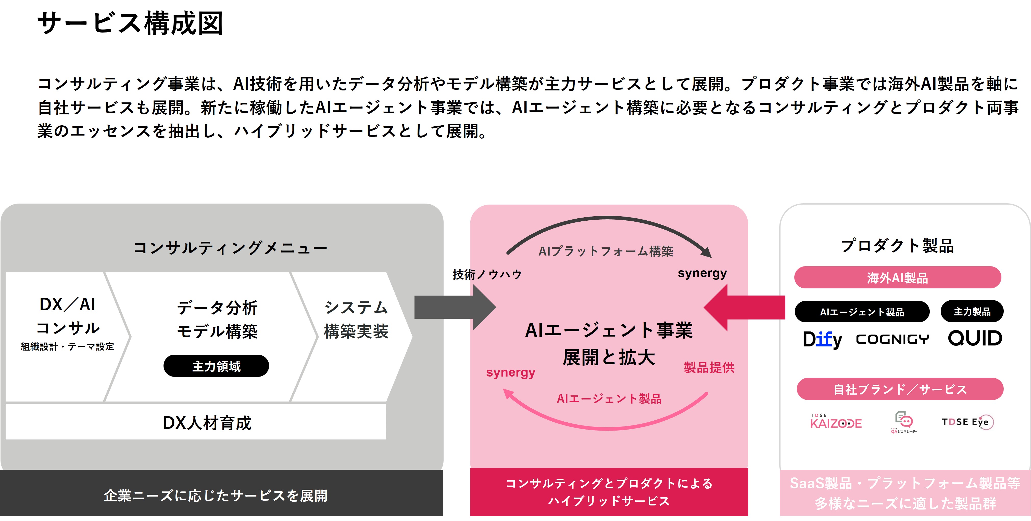 当社は、データおよびAI活用のノウハウをコアバリューとするデータサイエンティストやエンジニアが、様々な業界・業種の企業における課題解決するに向けたコンサルティング事業を展開しておりますが、AI製品等を販売するプロダクト事業を拡大させることにより、データ経営を目指す企業の業務改革や新事業構築を支援しております。