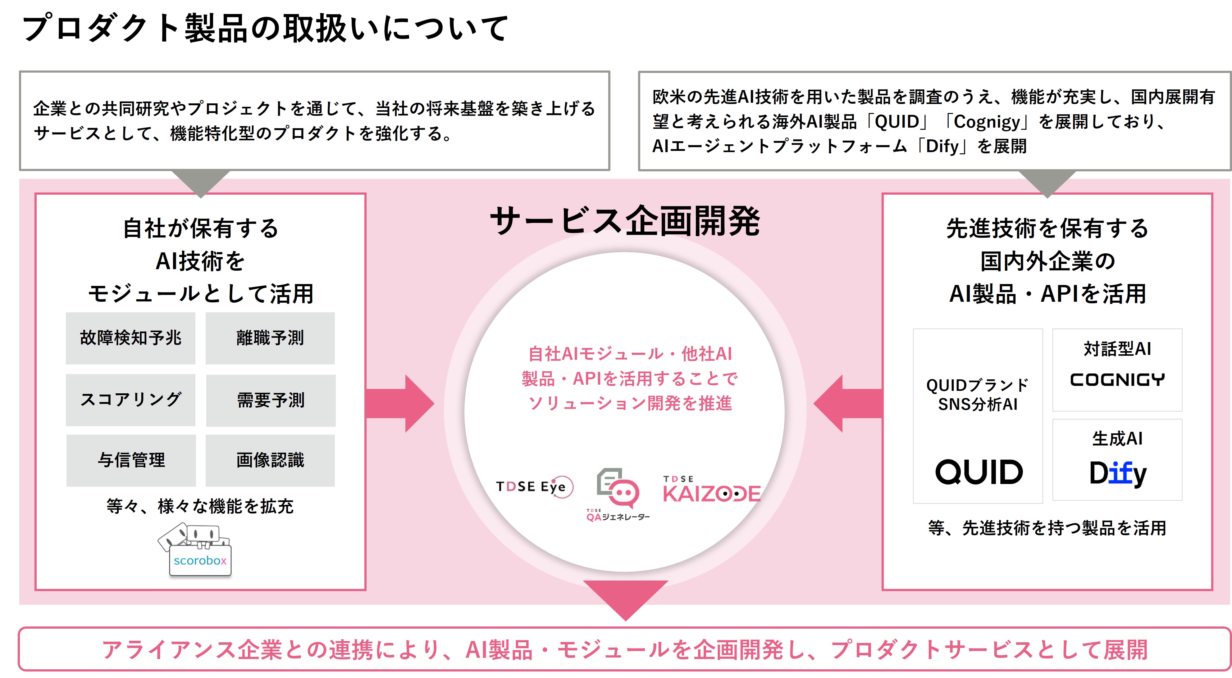 当社独自AI製品「TDSE」シリーズや他社AI製品などの製品販売、または業務特有のAIモジュールを顧客企業向けに提供し、使用料および運用保守料を受領するプロダクト事業を推進しています。