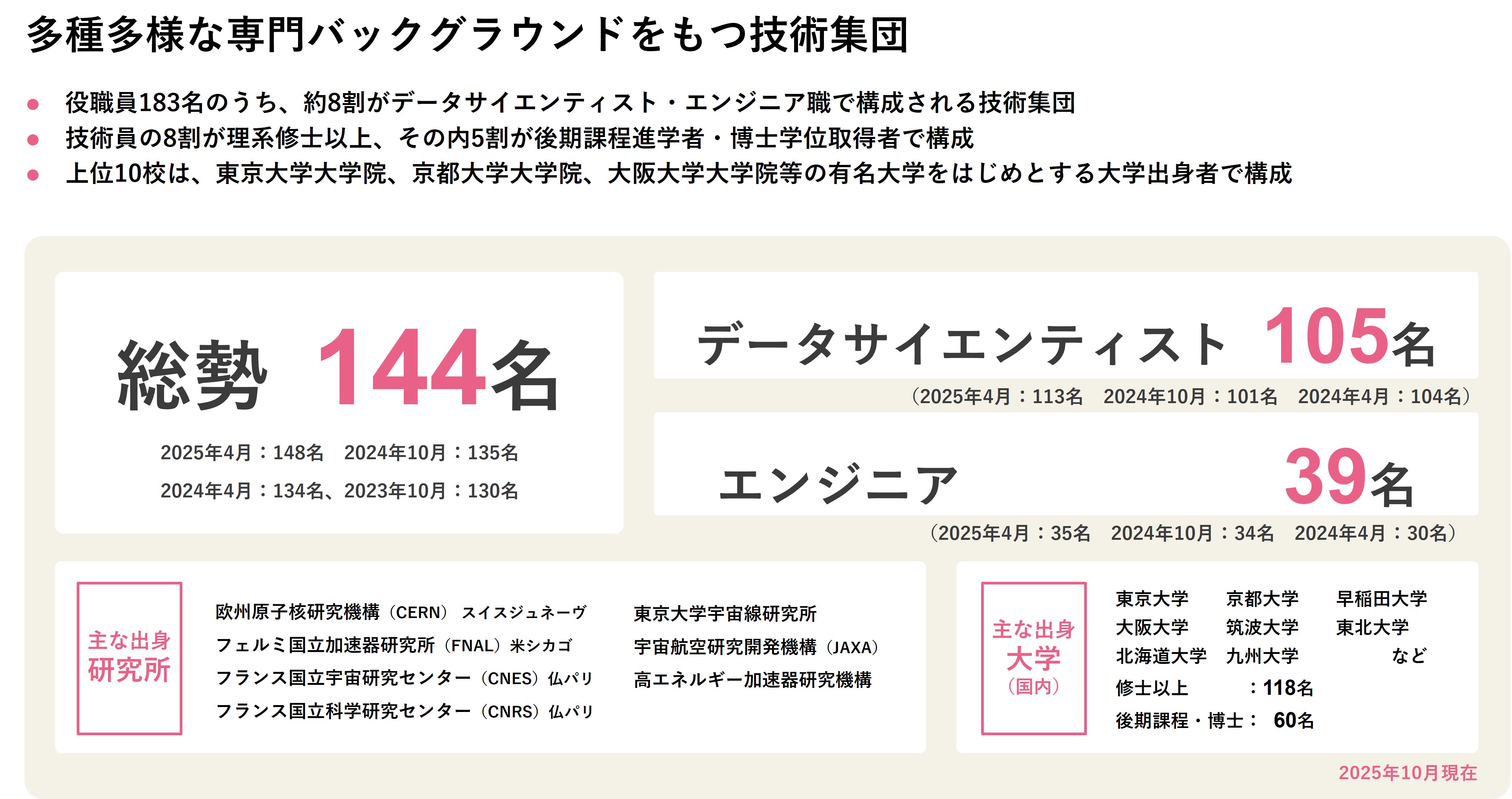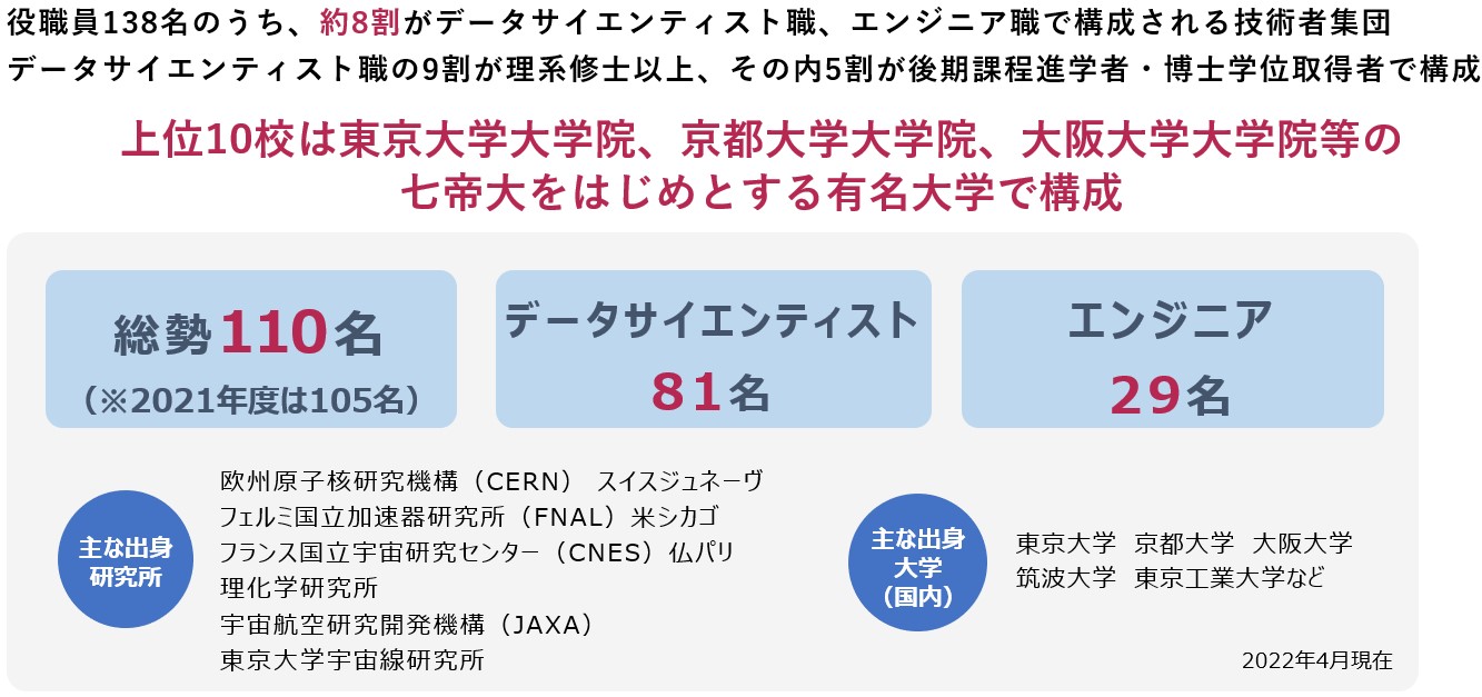 当社の社員は、8割以上がデータサイエンティストとエンジニアで構成されています。データサイエンティスト職の9割が理系修士以上、その内5割が後期課程進学者・博士学位取得者で構成され、先進国の研究所で解析技術・知識を得た多彩な人材が多数おり、国内最高峰のデータサイエンティスト集団と自負しております。