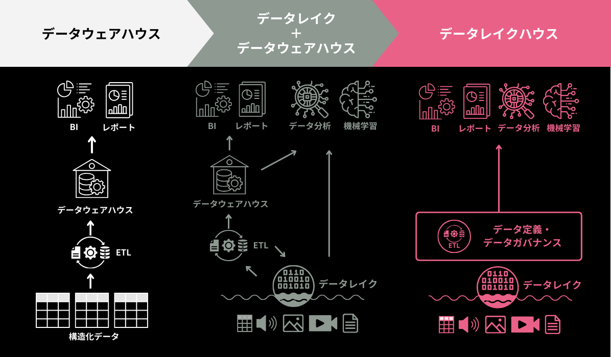 一方で、様々な形式の生データを格納することができないというデメリットがあり、それを補完するために、データレイク(生データの保管)+データウェアハウス(ETLで構造化データに変換)で様々な形式のデータを必要な時にタイムリーに可視化、分析できるようにしてきました。
