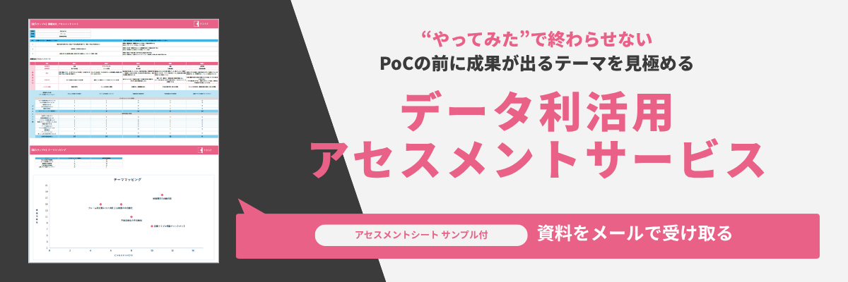 「このテーマに使えるデータがあるのか」「そのデータは質・量の面で足りているのか」といった判断ができず、テーマの実現可能性を評価できないという悩みも多くあります。